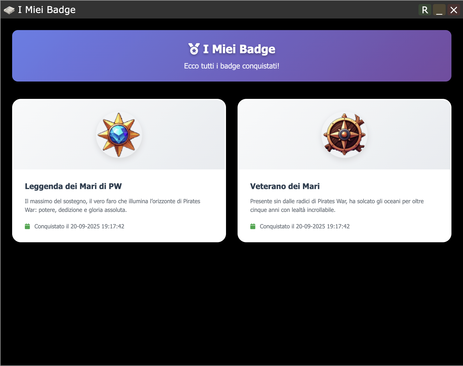 Soddisfando diversi requisiti potrai fregiarti di badge speciali che ti qualificano e ti mettono in mostra tra i giocatori di Pirates War. Una volta ottenuto un badge ti verrà mostrato da una notifica in alto a sinistra. I tuoi badge possono essere passati in rassegna andando, dal Menù Principale, su Classifiche e quindi cliccando sul tuo giocatore > I miei badge.