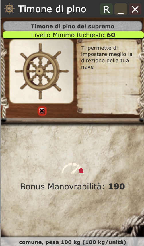 NB: il bonus di manovrabilità del timone esprime il tempo guadagnato in millisecondi nello spostamento della tua nave durante il combat.