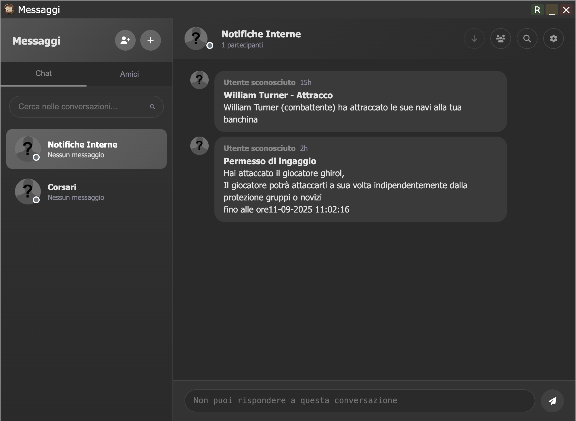 - Notifiche Interne: qui puoi trovare messaggi circa l'attracco dei giocatori al tuo porto, la richiesta di dogana, i permessi d'ingaggio, l'acquisto di beni dal mercato etc. etc.