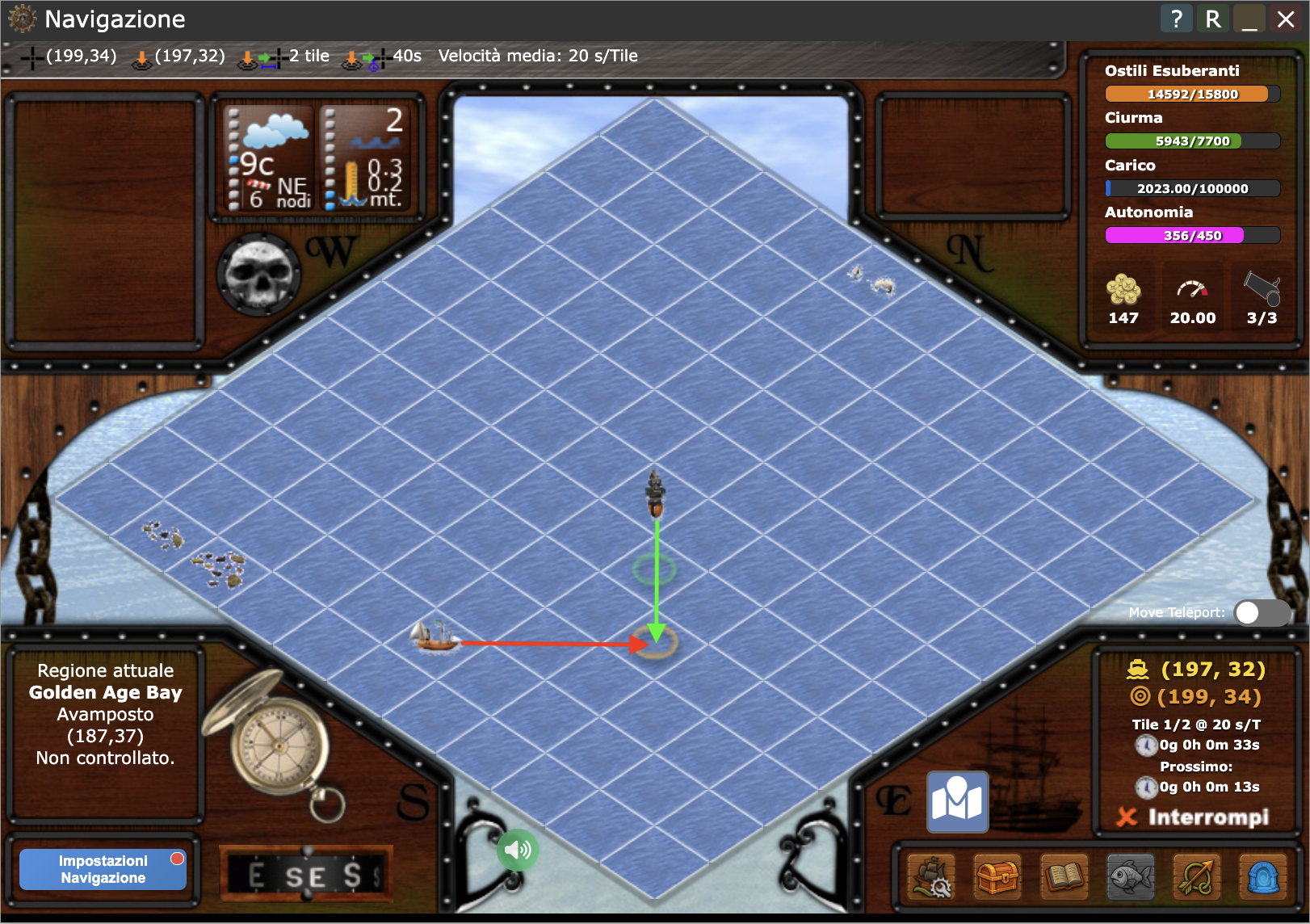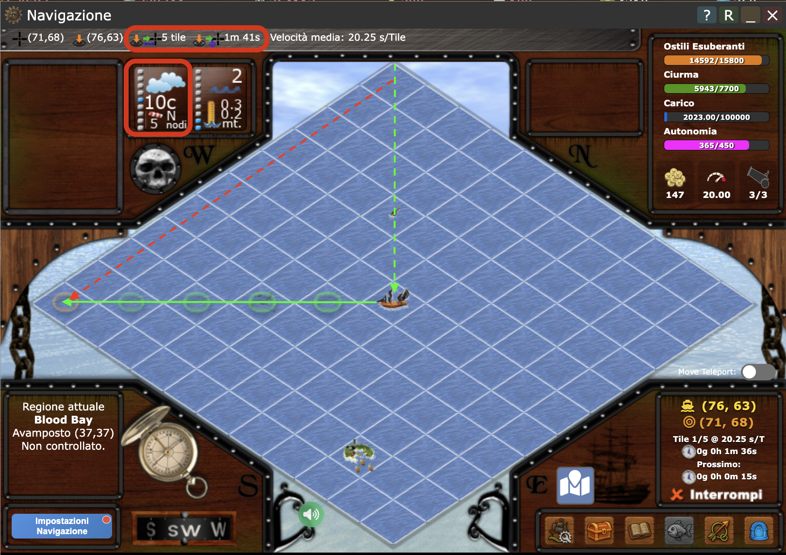 - Se tutto è andato bene, al refresh di pagina la tua nave non risulterà ferma, ma avrà cambiato tile e sarà già in navigazione verso il tile che avevi appena puntato