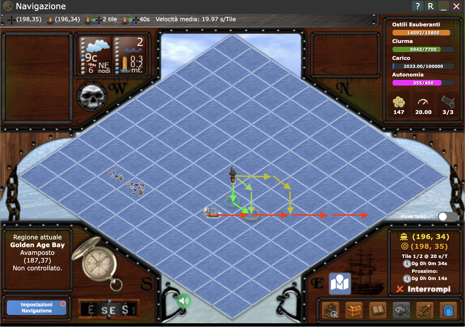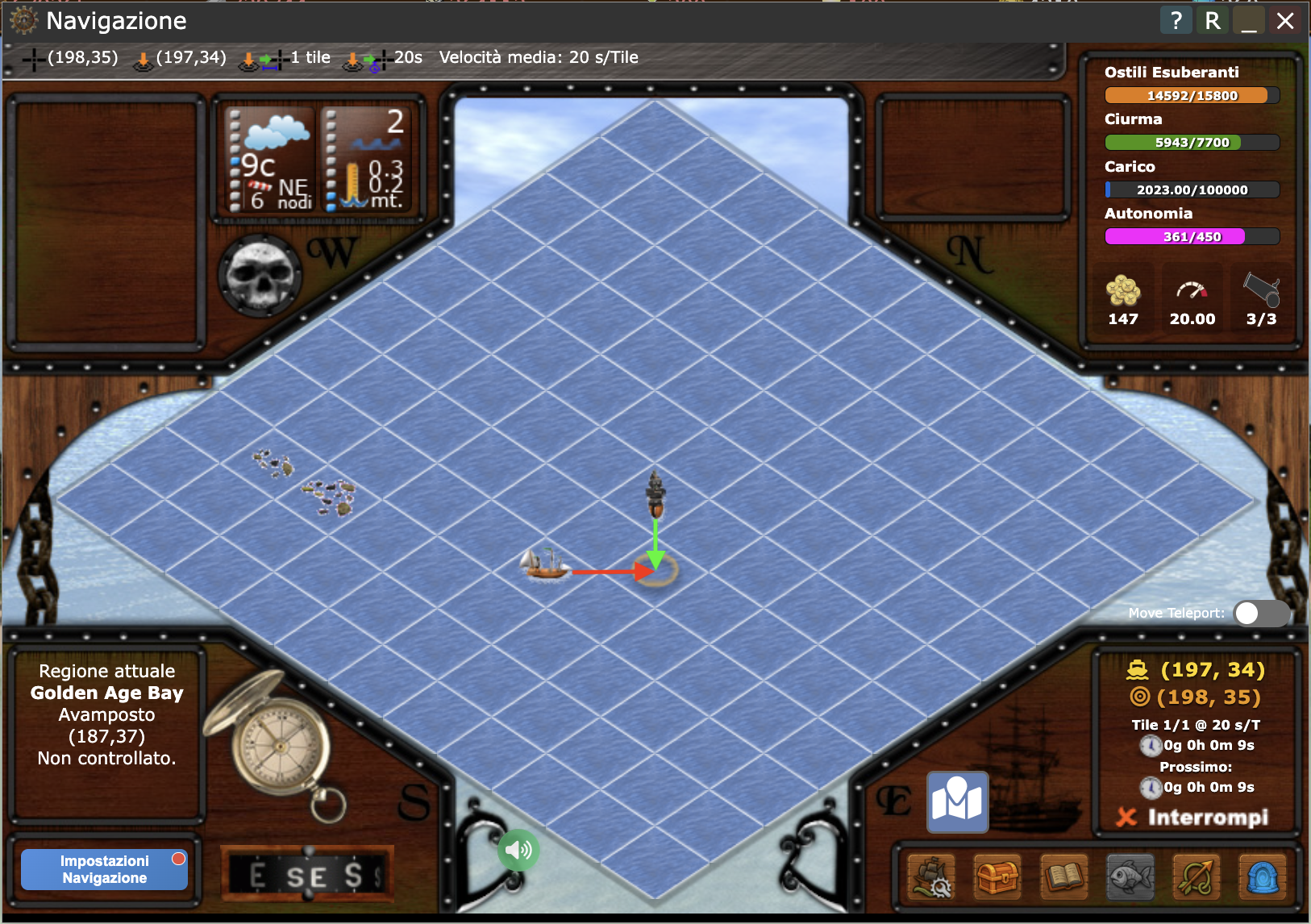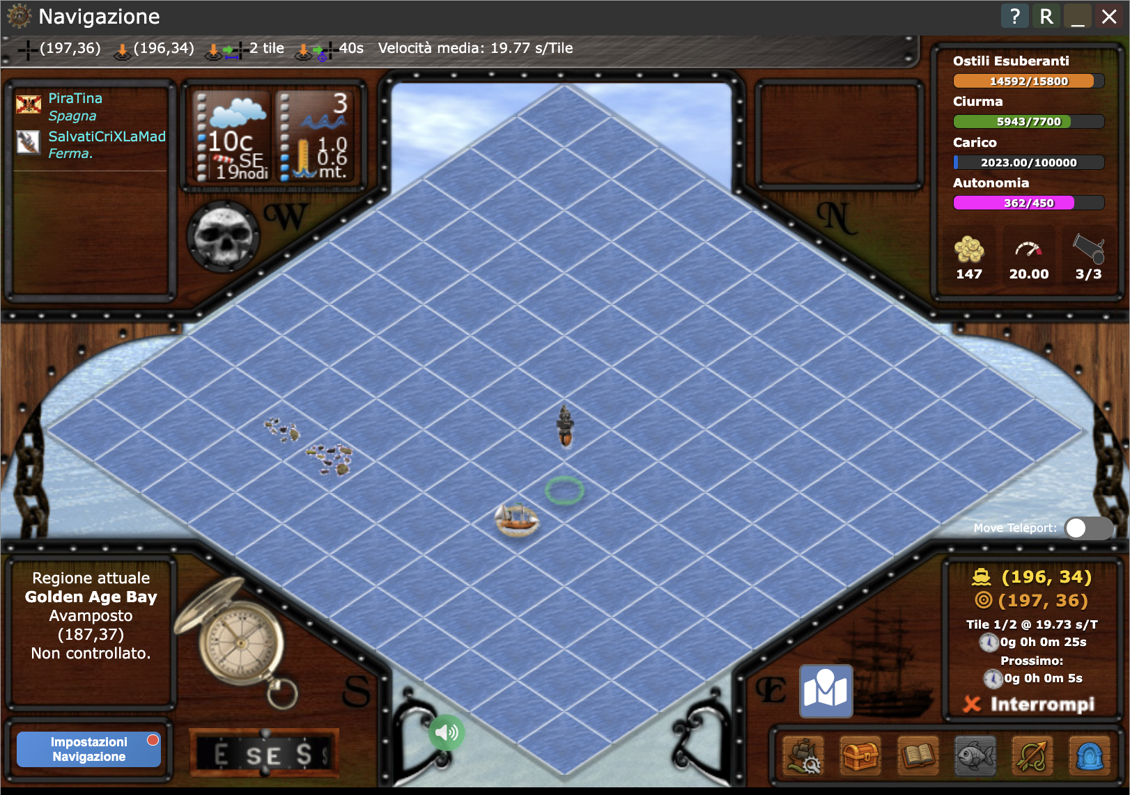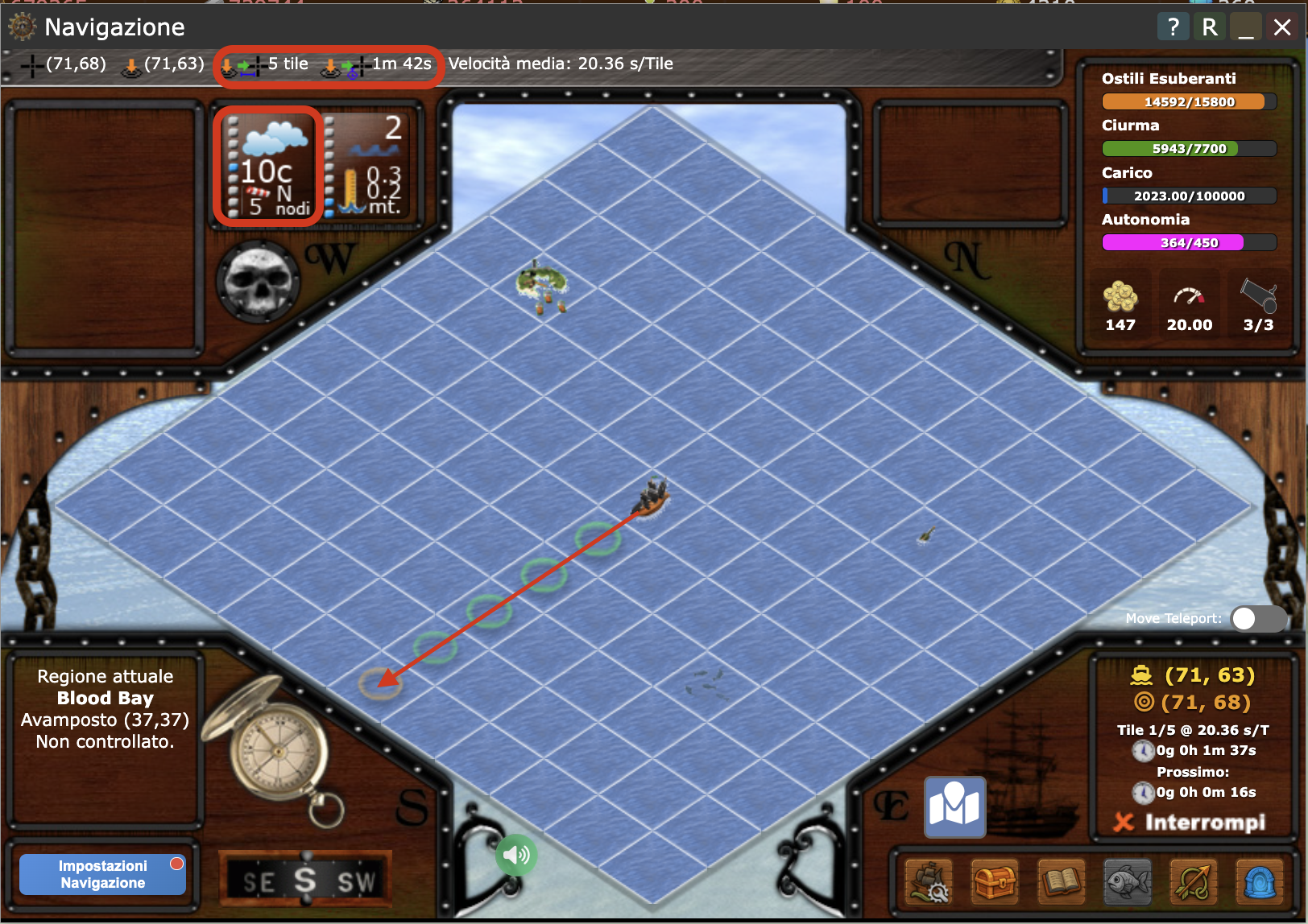 - Premere su di un qualsiasi tile di mare: se eri in navigazione, come detto prima, non cambierà la rotta e semplicemente si aggiornerà la pagina. Se non eri in navigazione, ma fermo, si imposterà una nuova rotta anche se comunque si aggiornerà la pagina.