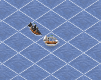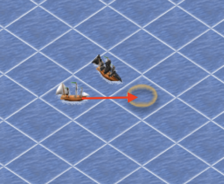La geometria di Pirates War non è la stessa del mondo reale. Difatti, tecnicamente muoversi in diagonale (ovvero in direzione NE/NW/SE/SW) dovrebbe richiedere più tempo: in teoria 1.414 volte il tempo che impieghi per spostarti verticalmente o lateralmente (in direzione N/S/E/W). Su Pirates War invece il tempo richiesto per spostarsi di un tile è il medesimo in tutte le direzioni (fermo restando l'assenza di bonus/malus derivati da condizioni meterologiche come il vento). Questo errore originale di programmazione è stato mantenuto nel tempo perché rappresenta la base della tattica di inseguimento/fuga su Pirates War (come imparerai successivamente).